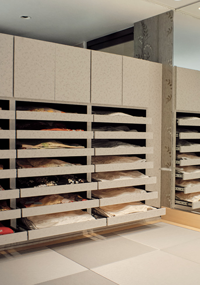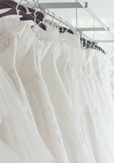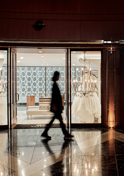 新郎・新婦さまをお迎えするエントランスディスプレイは、クラシックでありながらシャンデリアの柔らかな光に包まれた煌めくドレスたちが出迎えます。店内の中央には上質でくつろげるラウンジスペースや、完全個室のブライダルフィッティングルーム4室完備し、特別な時間をひとり占めにできます。