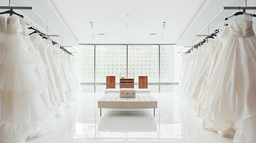 新郎・新婦さまをお迎えするエントランスディスプレイは、クラシックでありながらシャンデリアの柔らかな光に包まれた煌めくドレスたちが出迎えます。店内の中央には上質でくつろげるラウンジスペースや、完全個室のブライダルフィッティングルーム4室完備し、特別な時間をひとり占めにできます。